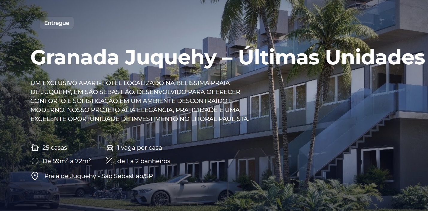 O Granada Juquehy Apart Hotel é um projeto exclusivo localizado na Praia de Juquehy, São Sebastião – SP, desenvolvido para unir conforto, sofisticação e praticidade em um ambiente moderno e descontraído.